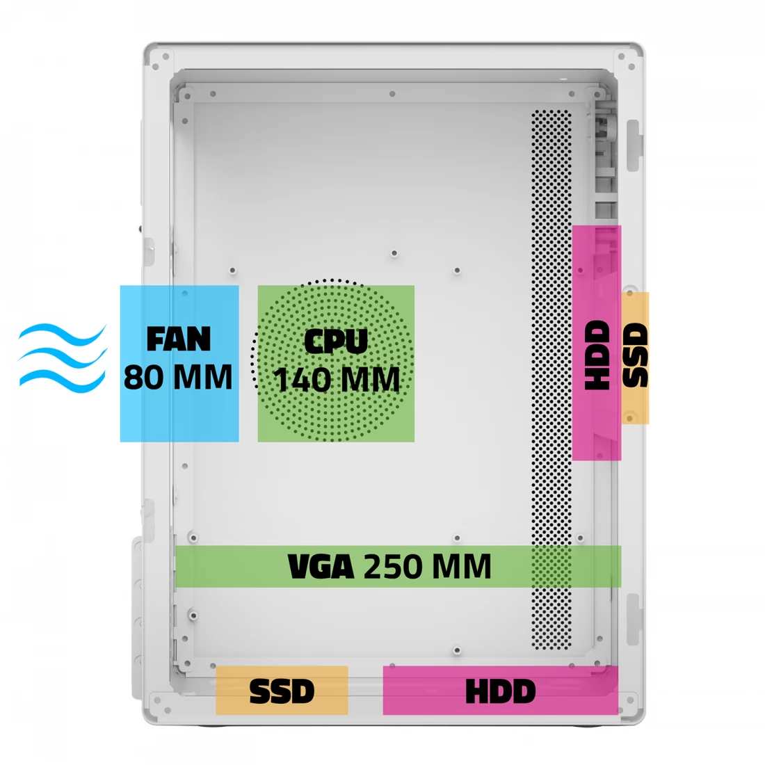 Računalno kućište OPTIMA nudi iznimnu svestranost zahvaljujući svojim mATX i mITX oblicima koji su prikladni za različite konfiguracije. Ima četiri priključka za proširenje koji vam omogućuju jednostavno proširenje sustava prema vašim potrebama. Uz to, s maksimalnom visinom CPU-a od 140 mm i VGA prostorom od 250 mm, može primiti komponente visokih performansi bez kompromisa.