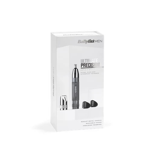 S BaByliss preciznim trimerom možete jednostavno voditi njegu dlačica u ušima, obrvama i nosu. Njegovo elegantno crno kućište uređaja i izdržljiv metalni materijal osiguravaju dug radni vijek i udobnu upotrebu.
