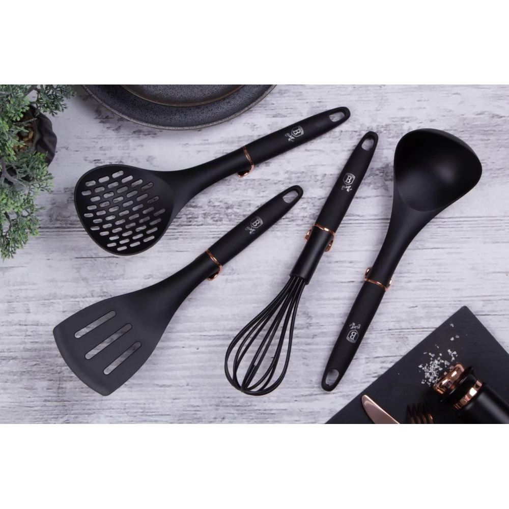 Kuhinjski set alata ima kombinaciju crne i ružičasto zlatne boje, što kuhinji daje elegantan i moderan izgled.