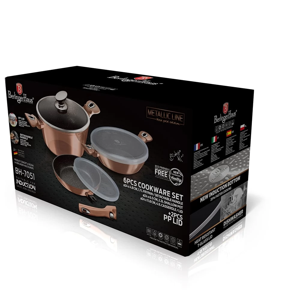 Set posuđa Metallic Line Rose Gold Edition ne preporučuje se samo za moderne kuhinje, već može biti i stilsko rješenje koje pristaje uz svaki interijer. Osim visokokvalitetnih materijala i vrhunskog korisničkog iskustva, set je i energetski štedljiv jer turbo indukcijska baza može uštedjeti do 35% energije. Ne oklijevajte, odaberite set posuđa Metallic Line Rose Gold Edition i uživajte u jednostavnom i ugodnom iskustvu kuhanja!