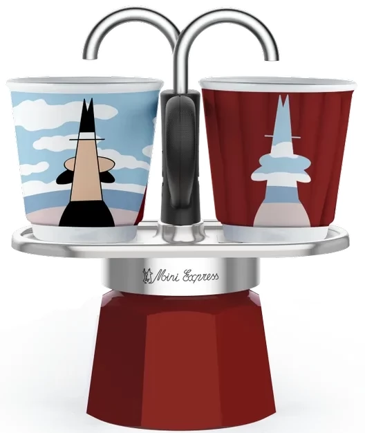 Mini Express Aparat za sušenje kave u kolekciji Arte, stil René Magritte. Popularni Mini Express već je dostupan s dva espresso šalica u Art kolekciji, u stilu René Magritte, poznatog slikara Realist filtra. Mini Express ima ručku koja se lako može ravnomjerno ukloniti iz hoba. Umjetnički dizajn i sofisticirana tehnologija zajedno. Savršen je i za sve obožavatelje kao poklon. Dovršeni espresso teče izravno u čašu. Šalice se već zagrijavaju dok se voda zagrijava za 2 šalice za fini espresso. To je savršena sinteza dizajna, funkcije i kvalitete. Napravljeno od dvostrukog okretanja, visokokvalitetne i polirane aluminijske. Patentirani sigurnosni ventil Biletti. Pogodan je za sve izvore topline, osim indukcijske ploče.