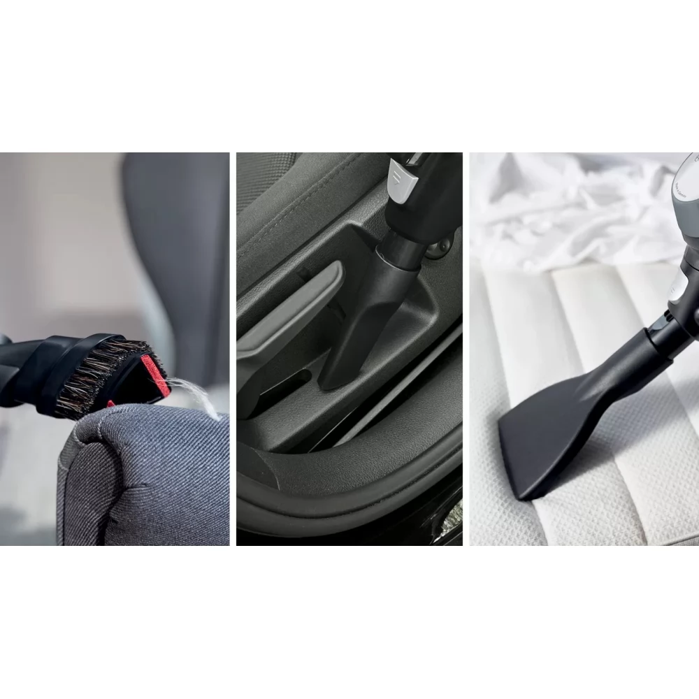 Uživajte u svestranosti! Uz praktičnu Flex Tube možete lako dosegnuti mjesta ispod niskog namještaja, uz Easy Parking Clip možete sigurno držati uređaj na mjestu kada se odmarate, a Quick Stand omogućuje fleksibilno ručno čišćenje, dok mlaznica i cijev stoje neovisno. Uz Nozzle Foot Release, možete odvojiti mlaznicu od cijevi bez saginjanja, tako da se možete jednostavno prebaciti na čišćenje na licu mjesta s praktičnom cijevi. Zbog toga je Unlimited 7 savršen za čišćenje svih vrsta podova i površina, kao i teško dostupnih mjesta.
