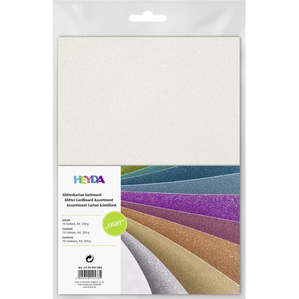 Set sadrži 10 komada svjetlucavog kartona 200 g/m2. Jedna strana ima prelijevajuću se svjetlucavu površinu, stražnja strana je bijela. Pakiranje sadrži 10 boja: pijesak, limun žuta, narančasta, crvena, zelena, svijetlo zelena, orhideja, svijetlo plava, breskva, sunčano žuta.