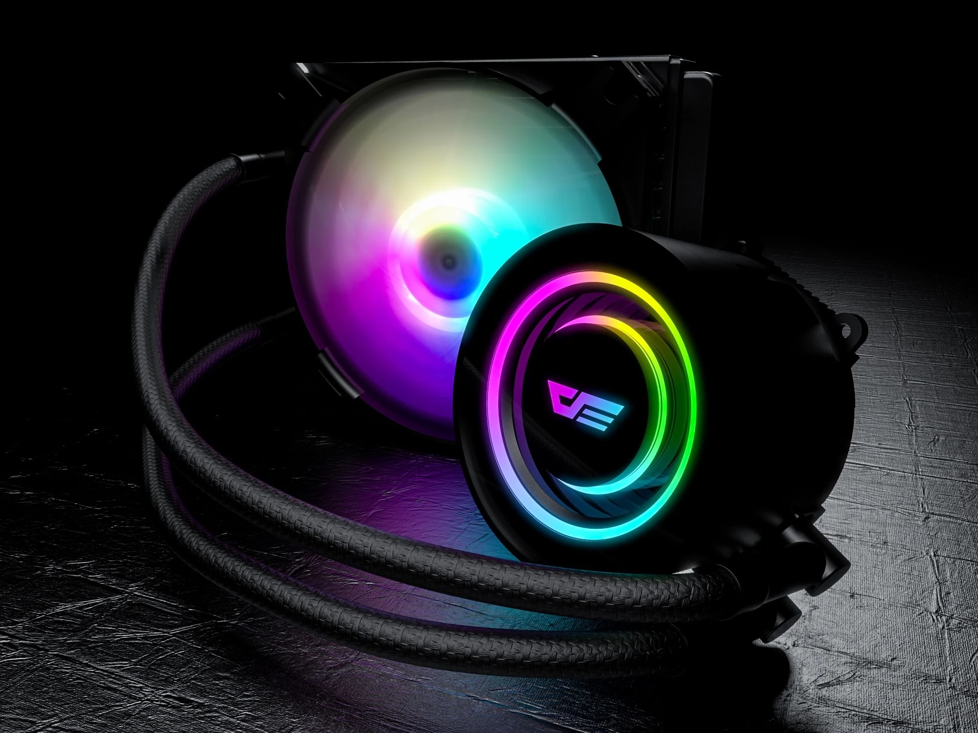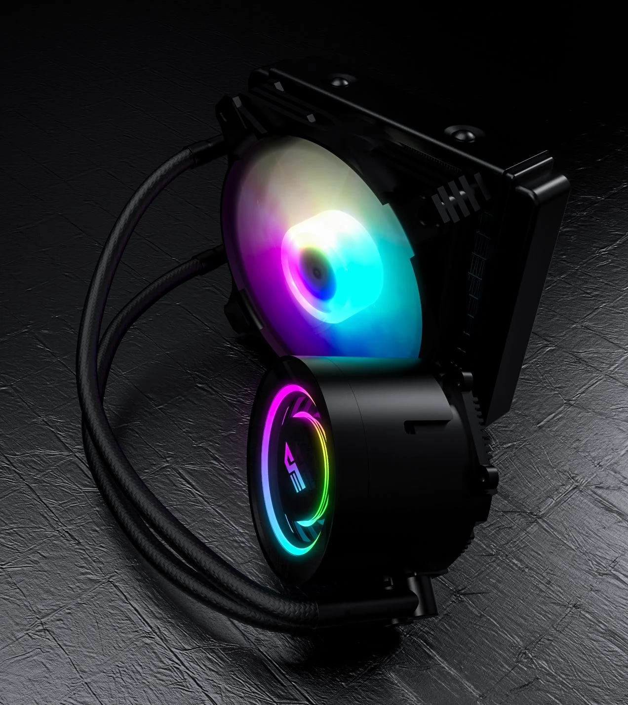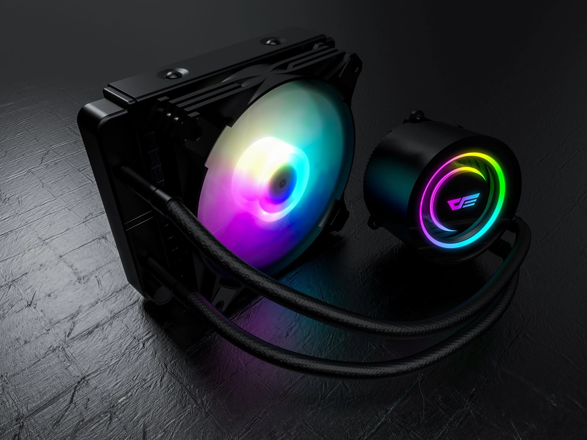 Kompaktno, univerzalno CPU vodeno hlađenje s jednim upravljivim ARGB rasvjetnim ventilatorom, radijatorom od 120 mm i također upravljivim ARGB rasvjetnim CPU blokom vodenog hlađenja.