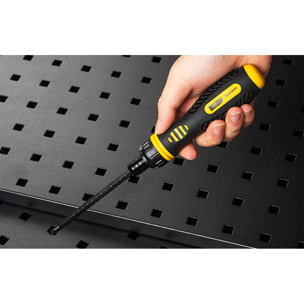 EDL626011 odvijač s čegrtaljkom tvrtke Deli Tools pruža visoku razinu udobnosti tijekom vašeg rada. Drška je izrađena od kombinacije TPR i PP materijala, što jamči iznimnu izdržljivost i siguran zahvat. Alat je opremljen čegrtaljkom visokog momenta koja je odgovorna za jednostavan rad bez napora.