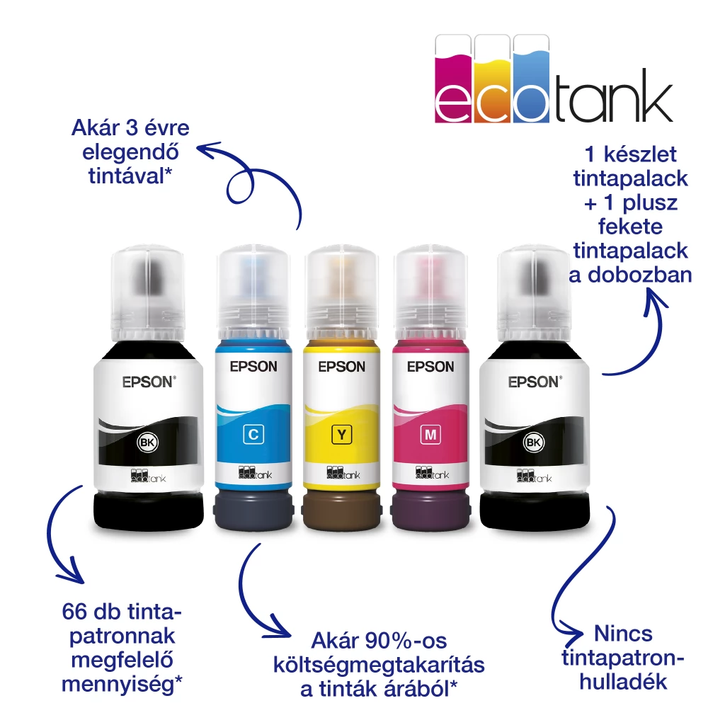 Pomoću ovog EcoTank pisača možete uštedjeti do 90%troškova ispisa, a mi ćemo dodati dovoljno tinte do 3 godine. Priložena tinta može ispisati do 14 000 crno -bijelih i 5200 stranica u boji, a zamjenske palete s tintom pružaju do 66 spremnika s tintom.
