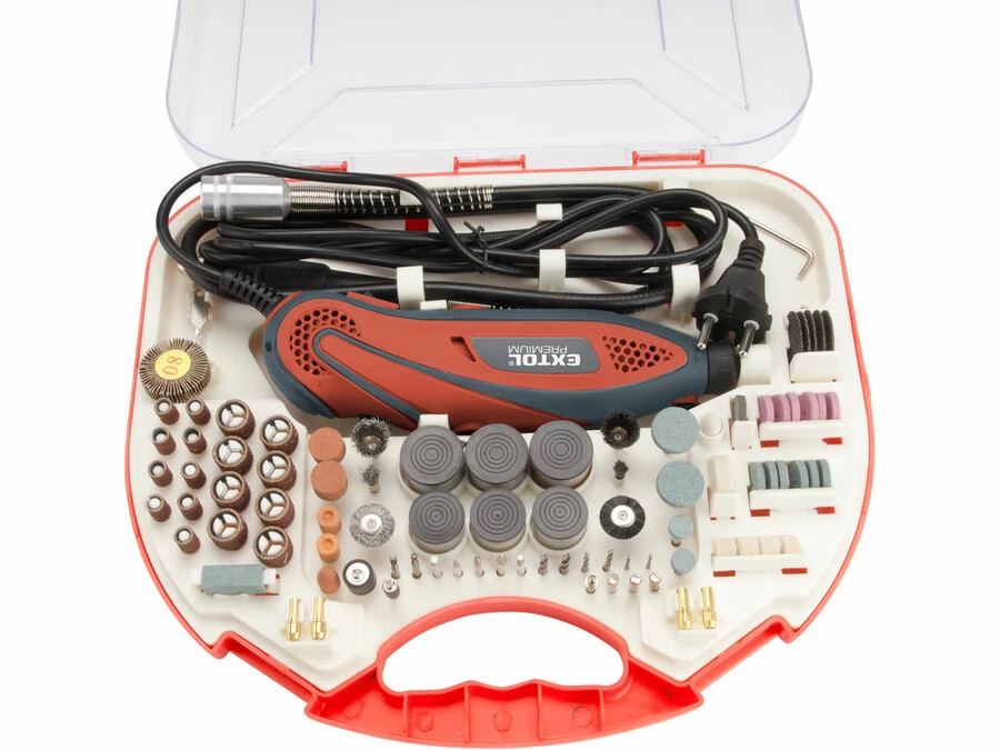 Mala brusilica za fino graviranje, za preciznu obradu drva, metala ili plastike i za rad u skučenim prostorima. Bogat i kompletan set pribora omogućuje vam obavljanje bilo kojeg posla. Zahvaljujući savitljivoj dršci, pogodan je za fini i precizan rad, uz maksimalnu udobnost. Zahvaljujući 210 dodataka, možete odmah početi brusiti, rezati, polirati, bušiti, gravirati.