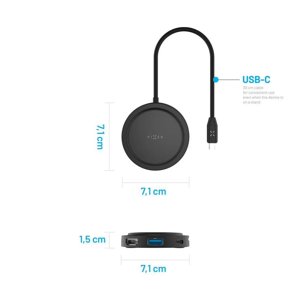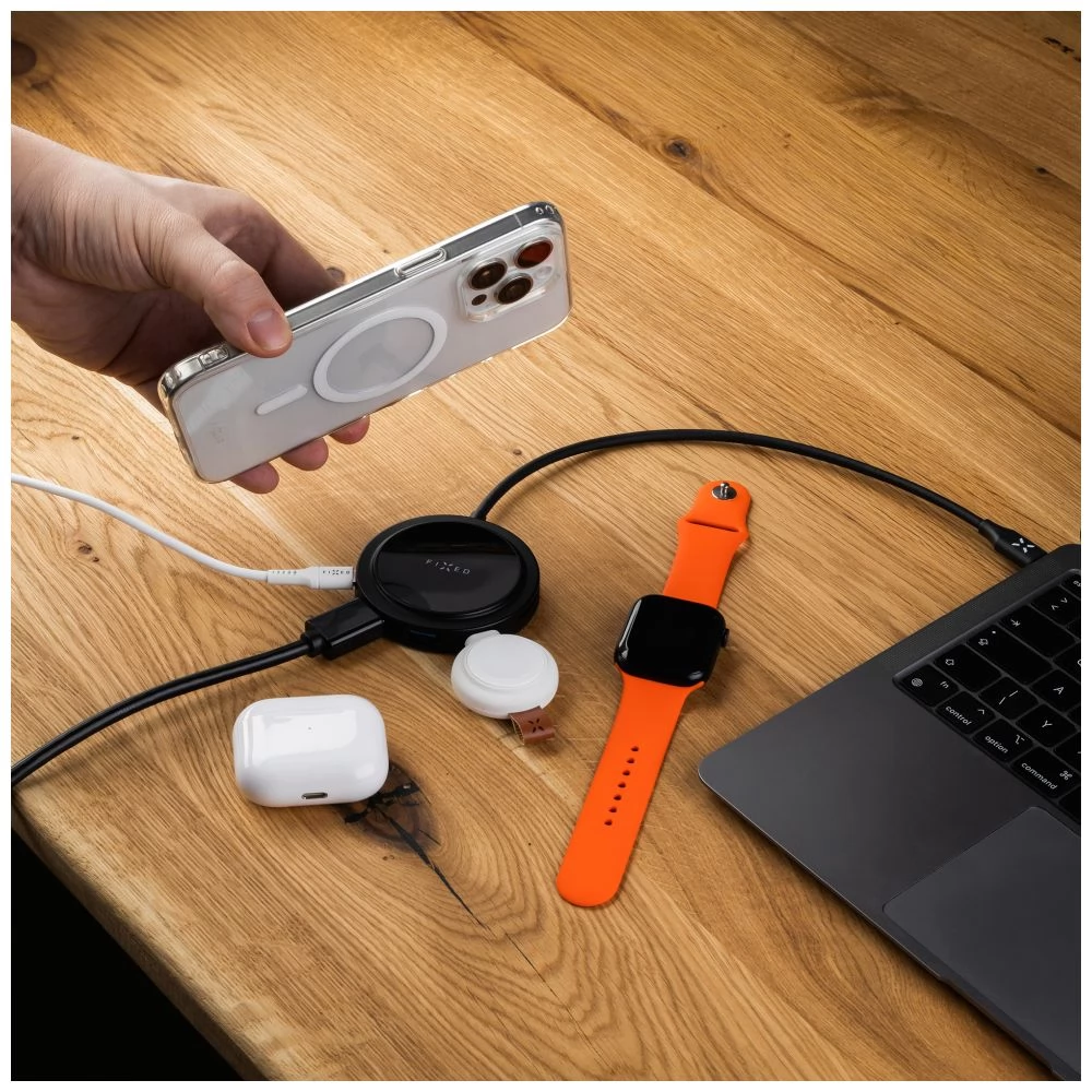 Minimalistički FIXED MagHUB kombinira korisne priključke za proširenje mogućnosti vašeg računala, kao i MagSafe punjač za telefon. Gornja površina HUB-a opremljena je zavojnicom za bežično punjenje s podrškom za MagSafe, tako da sve što trebate učiniti je postaviti telefon na površinu za punjenje i punjenje će započeti. Nakon spajanja na raspolaganju će vam biti ukupno 6 priključaka: USB-C priključak za napajanje s podrškom za PD 3.0 i velikom snagom do 100 W, HDMI priključak s 4K 60 Hz rezolucijom, čitač SD/micro SD kartica i podataka portovi USB-A 3.2 Gen1 i USB-C 3.2 Gen1 na koje možete spojiti miša, tipkovnicu, eksterne diskove i ostale dodatke. Više se ne morate odlučivati između punjenja prijenosnog računala ili povezivanja vanjskih dodataka, zahvaljujući FIXED MagHUB-u možete spojiti sve što vam je potrebno odjednom. HUB je povezan s uređajem preko 30 cm USB-C kabela koji omogućuje fleksibilnost i prilagođava se potrebama radnog prostora. U pakiranju je i praktična torbica za lakše nošenje u torbi ili ruksaku.