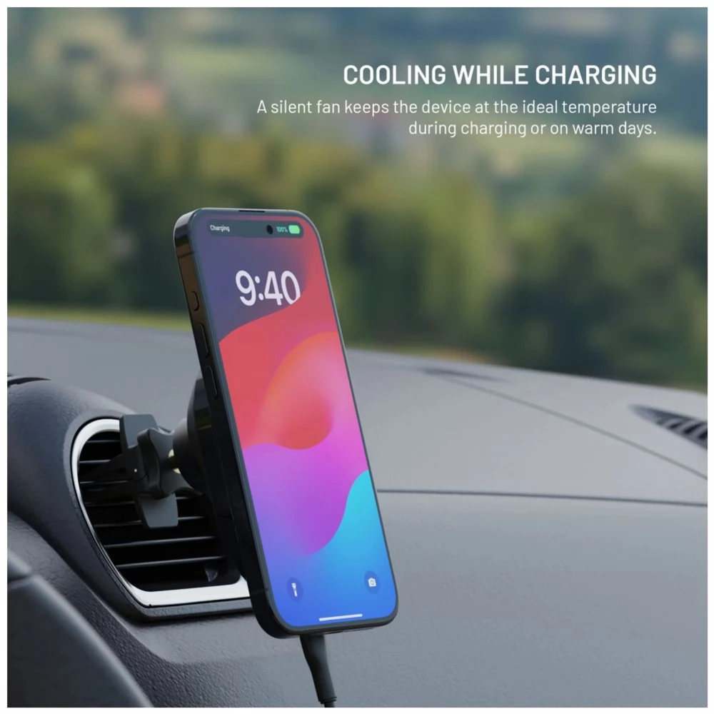 Fiksni držač za ventilaciju magnetskih automobila omogućuje vam da naplatite udoban bežični bez vožnje. Zahvaljujući QI2 certifikatu, on pruža najbrže bežično punjenje za sve uređaje koji podržavaju ovu tehnologiju. Izgrađeni -U magnetima pružaju točno i čvrsto držanje telefona s magsafe ili kompatibilnim poklopcem. Telefon se automatski podešava, ne ometa područje kamere i održava telefon stabilnim čak i kad vozite pop. Držač sadrži aktivni ventilacijski sustav s mirnim ventilatorom na opsegu površine punjenja. Veća snaga punjenja stvara veću toplinu, što može usporiti naboj. Međutim, zbog učinkovite ventilacije, uređaj drži optimalnu temperaturu i punjenje je stabilno. Prednja površina očvrsnog stakla daje držaču elegantan izgled, ali cijeli držač opremljen je UV slojem, koji materijal štiti od sunčeve svjetlosti. Nosač je pričvršćen kopčom s obrnutim kukom koja se zaglavila u ventilatoru i čvrsta je čak i kad se trese. Rotirajući spoj omogućuje vam lako podešavanje idealnog kuta gledanja jednom rukom. Sam fiksni je praktično rješenje za sigurno postavljanje telefona i brzo bežično punjenje tijekom vožnje.