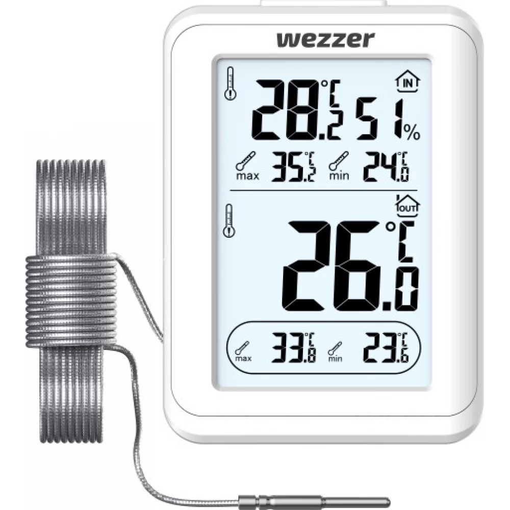 Vrijednosti glavne jedinice mogu se vidjeti na vrhu zaslona, a vrijednosti izmjerene termalnom sondom na dnu. Osim trenutne temperature, obje jedinice također pokazuju minimalnu i maksimalnu vrijednost. Osim toga, glavna jedinica također mjeri vlažnost zraka.