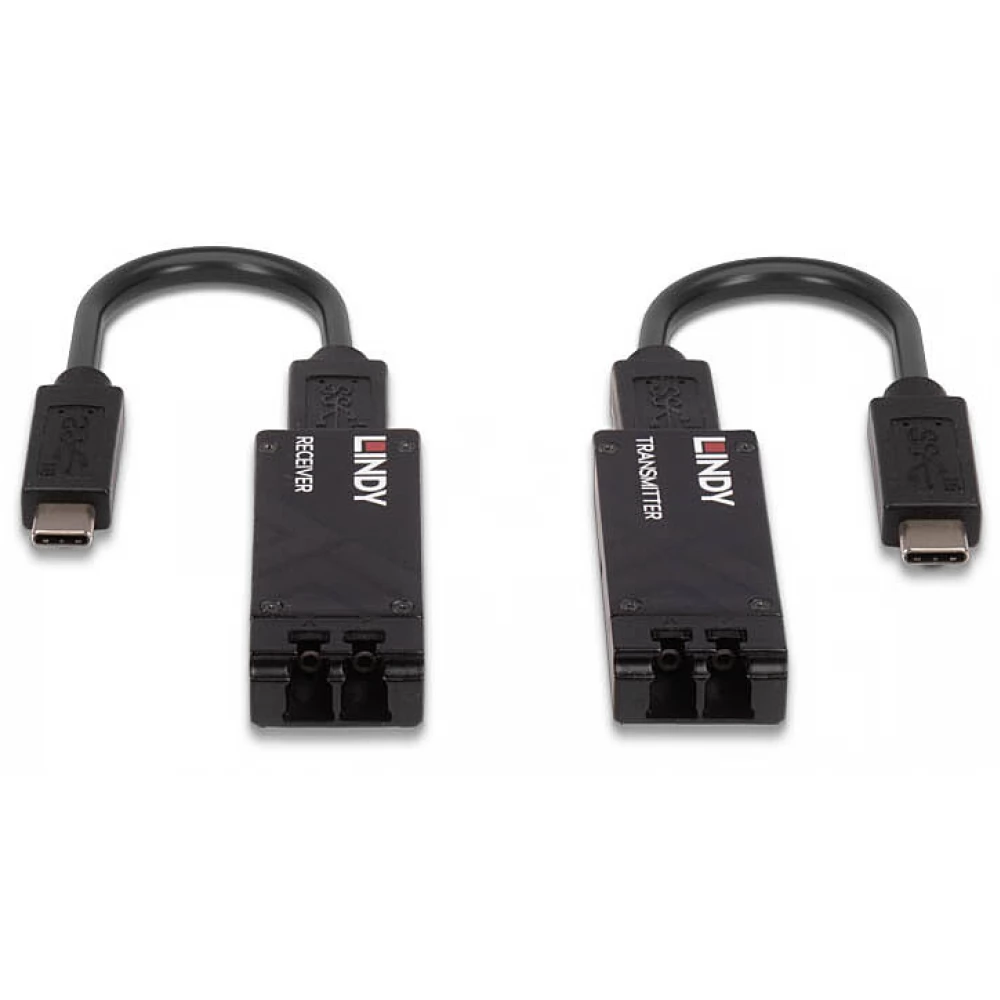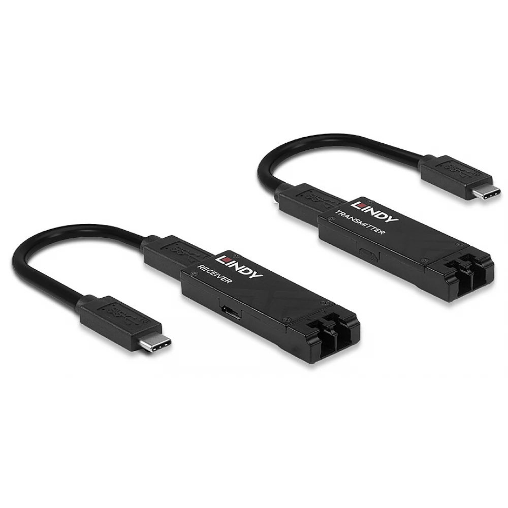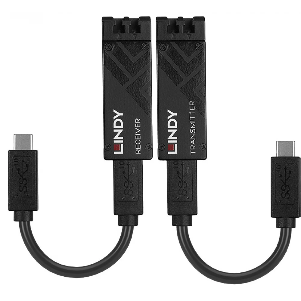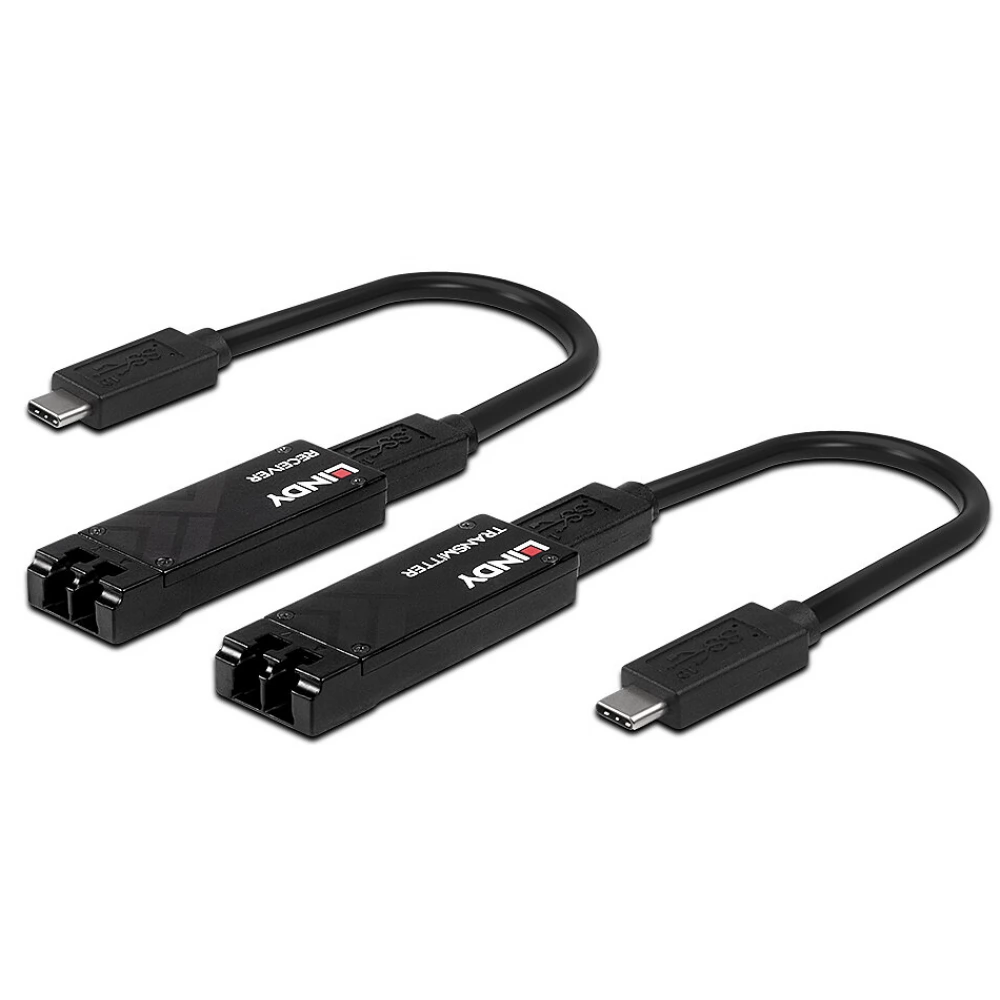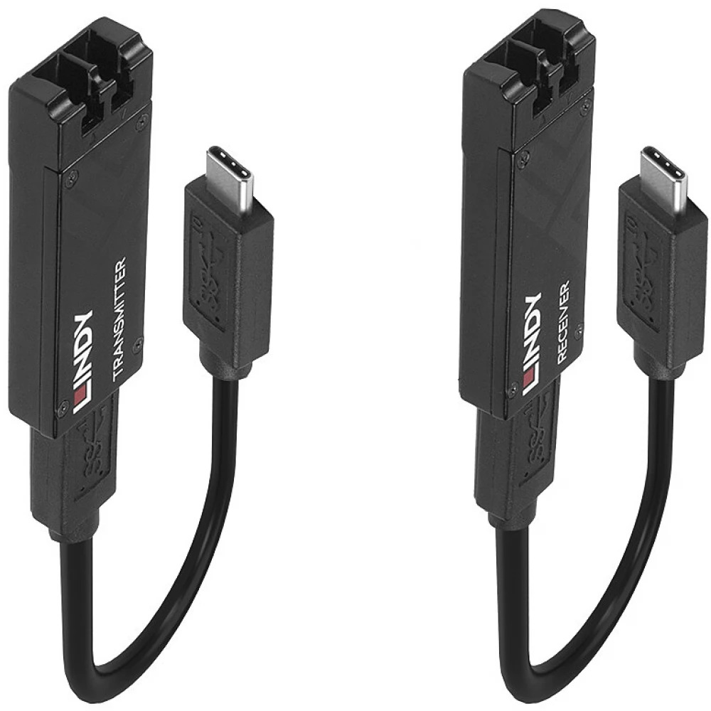 USB produžnici s optičkim vlaknima omogućuju proširenje USB signala izvan granica tradicionalnih rješenja bakrenih kabela. Lindy 100m Fiber Optic USB 3.2 Type C Extender podržava brzinu prijenosa do 10 Gbps SuperSpeed. Ovaj Extender je cjelovito i kompaktno hardversko rješenje iz dva dijela koje se sastoji od odašiljača koji se spaja izravno na korisničko računalo i prijemnika koji se povezuje na USB periferiju s LC duplex fiber kabelom.