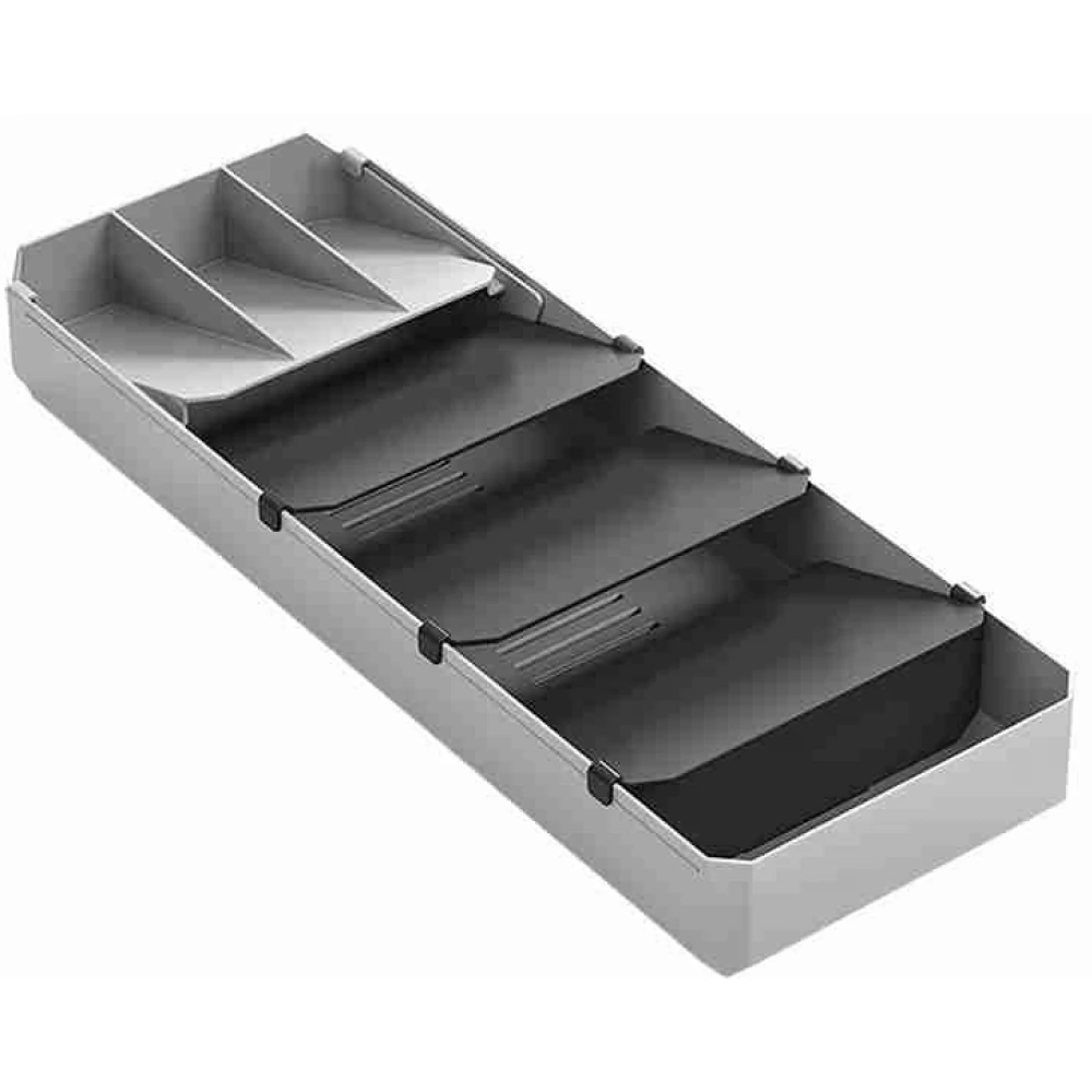 Uni-Fit podesivi držač pribora za jelo. Za 90 uređaja. Organizirajte svoj pribor za jelo i kuhinjsko posuđe tako da na najučinkovitiji način iskoristite raspoloživi prostor u ladici. Podesite odstojnike na bilo koju duljinu pomoću podesivih odstojnika kako bi odgovarali svim vašim uređajima. S tri pomična razdjelnika, tako da odgovara uređajima svih veličina. Proizvod ne uključuje uređaje prikazane na slici!
