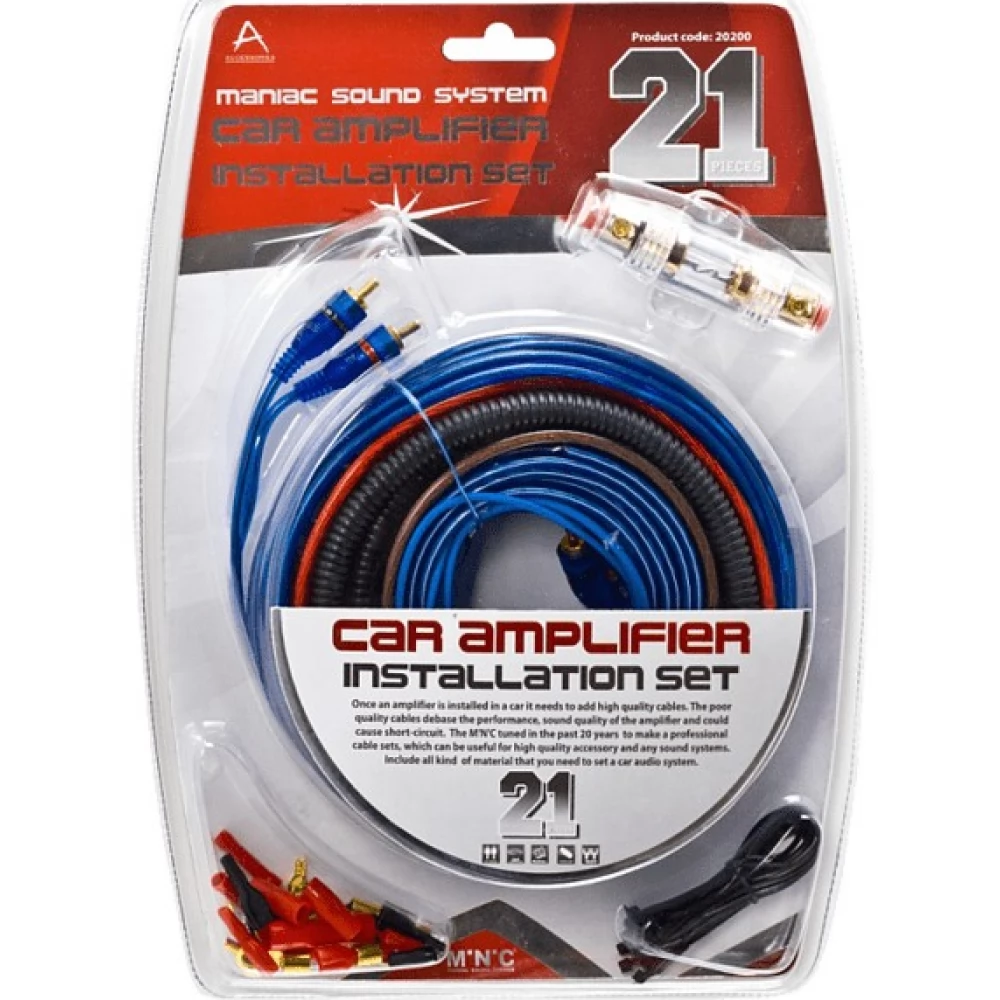 1 kom 8GA prozirni crveni kabel za napajanje (16ft / 5m), 1 kom 8GA prozirni crni kabel za napajanje (3ft / 1m), 1 kom Dvostruki RCA kabel (16ft / 5m), 1 kom prozirni plavi kabel za zvučnik (25ft / 7,6m), 1 kom Preklopna žica (16ft / 5m), 1 kom. Cijev grla (3ft / 1m), 1 kom. AGU vodootporni držač osigurača, 1 kom. 60A osigurač, 2 kom. pozlaćene "O" ušice, 2 kom. zlato -obložene - izolirane "O" stopice, 2 komada pozlaćene - izolirane "C" papučice, 4 klizne papučice, 1 set kabelskih vezica, 2 vijka