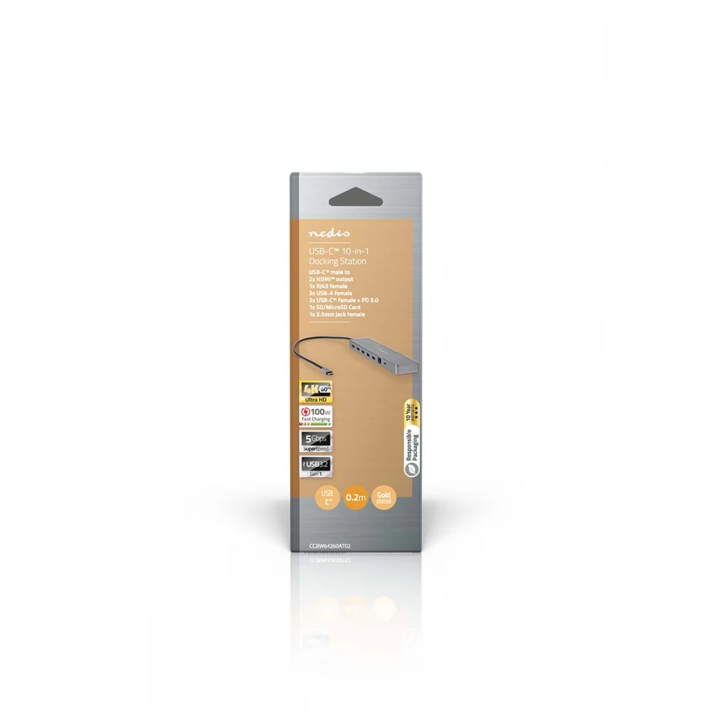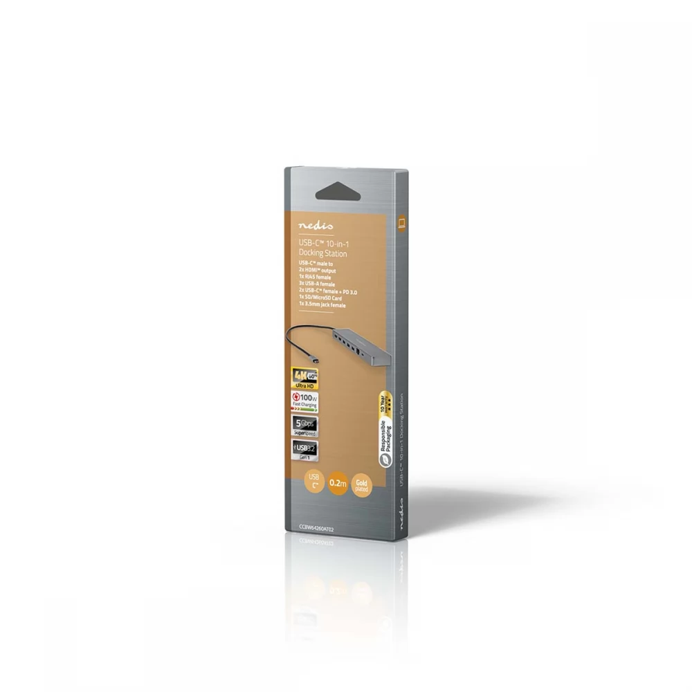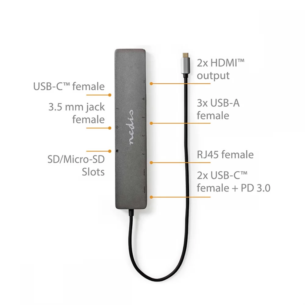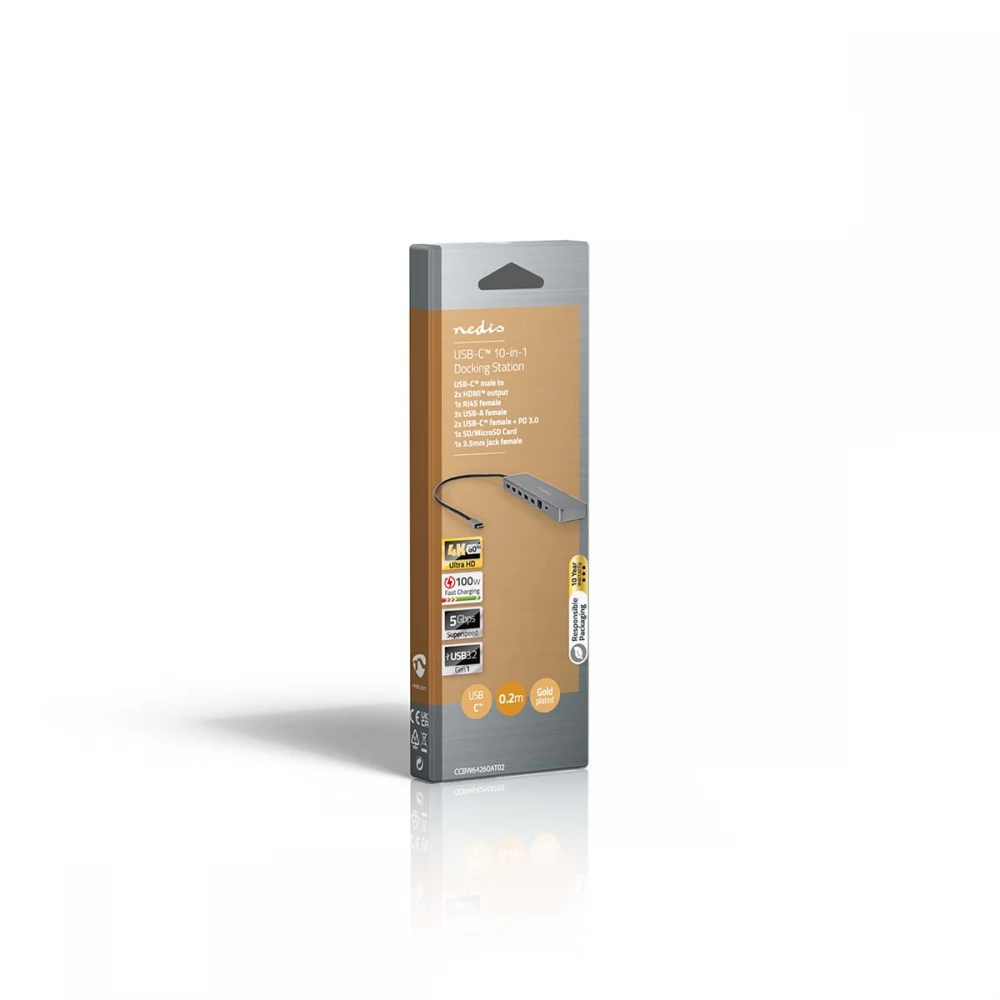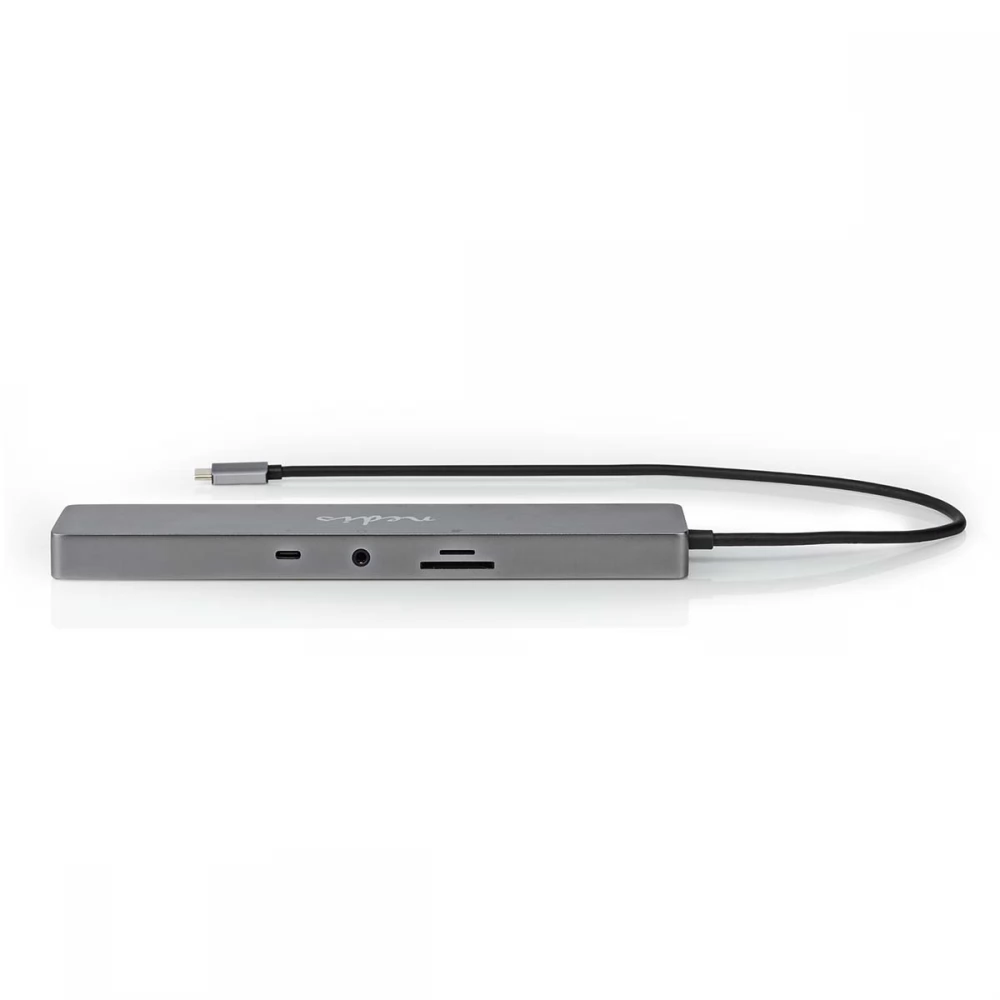 Ovaj Nedis 10-u-1 multi-docking adapter, prikladan za PC i Mac, pretvara vaše prijenosno računalo u potpunu radnu stanicu. Jednostavno spojite adapter na svoje prijenosno računalo putem USB Type-C® priključka. Ima 2x USB 3.0 Type-A i 1x USB-C™ ženski priključak s brzinama do 5 Gbit/s, što vam omogućuje povezivanje tvrdih diskova i drugih uređaja. Također ima USB-A 3.2 Gen 1 utičnicu i USB-C™ 3.2 Gen 1 utičnicu za brzi prijenos podataka i punjenje. Tehnologija USB Power Delivery omogućuje punjenje krajnjih uređaja naponom do 100 W. To znači da je idealan za prijenosna računala, ali se bez problema mogu puniti i čvorišta ili docking stanice. Dock je također opremljen čitačem (Micro)SD kartica.