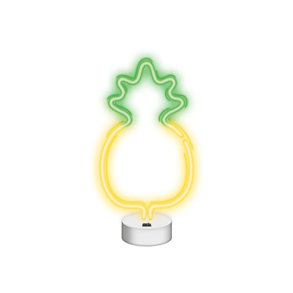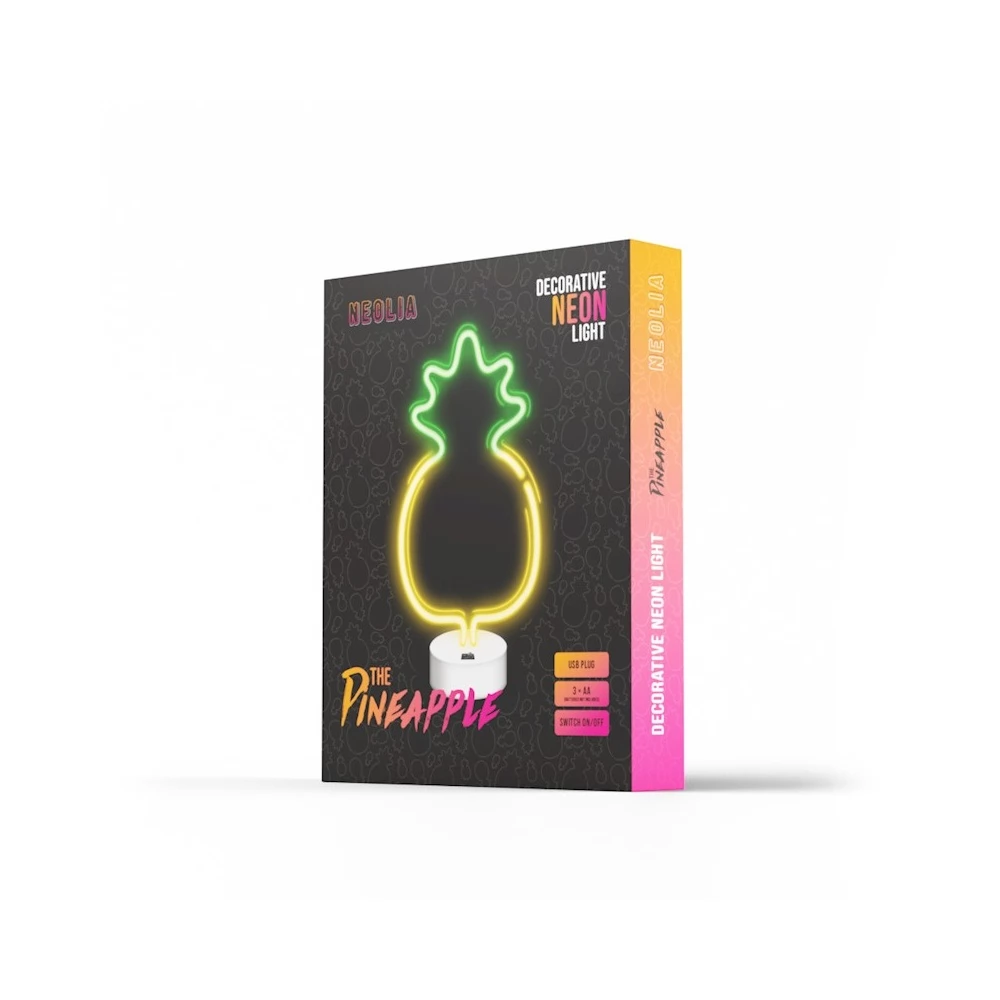 Zahvaljujući LED tehnologiji, neonska svjetla troše relativno malo električne energije. Mogu se napajati pomoću 3 AA baterije ili preko USB priključka. LED neonska svjetla dolaze u mnogim oblicima i bojama, uključujući bijelu, narančastu, zelenu, crvenu, ružičastu ili višebojnu. Ovaj uređaj je estetski i izrađen od bijele plastike. Još jedna prednost proizvoda je prekidač za uključivanje/isključivanje postavljen na postolje.