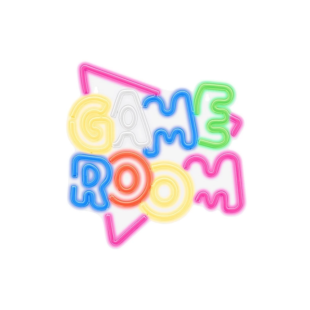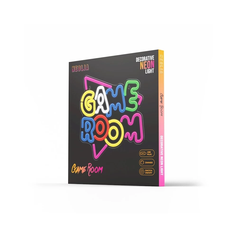 LED neonska dekoracija s prekidačem GAME ROOM ON/OFF i funkcijom kontrole svjetline pruža prekrasan efekt obojenog svjetla u sobi. Atmosferska rasvjeta odgovara interijeru, gdje boje jedinstveno ističu atmosferu mjesta. Neonska svjetla se razlikuju po tome što daju ravnomjernu raspodjelu svjetlosti bez vidljivih svijetlih točaka. Praktičan držač omogućuje vješanje na okomite površine. Ploča se napaja putem USB priključka, što znači da se može spojiti na računalo, punjač ili neki drugi uređaj s USB priključkom. Ploča je izrađena od prozirne i bijele plastike.