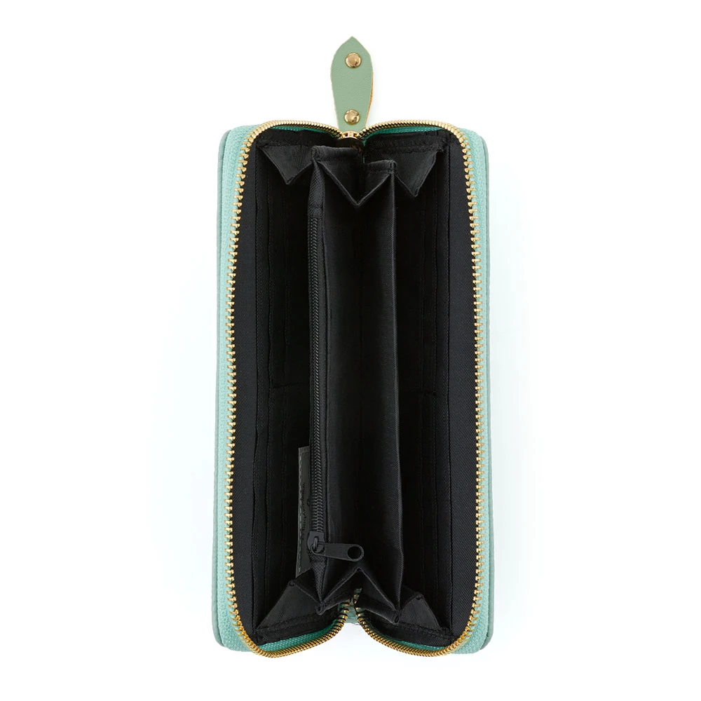 Veliki ženski novčanik mint boje. Unutra se nalazi 8 manjih džepova za kartice vjernosti, 2 veća džepa, 3 odvojena pretinca za gotovinu i 1 džep s patentnim zatvaračem za sitniš.
