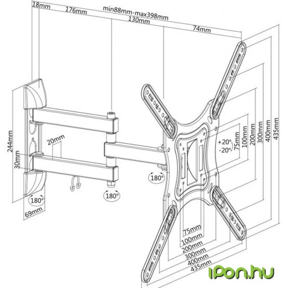 Nagibni ±20° i rotirajući zidni nosač.