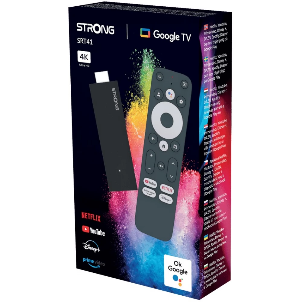 Gledajte svoje omiljene filmove izravno s Netflixa, YouTubea, Prime Videoa ili čak Disney+*. SRT41 nudi 4K UHD rezoluciju, H.265 dekodiranje, Dual Band Wi-Fi i Chromecast funkcije. Uz pomoć Google asistenta možete kontrolirati reprodukciju, glasovno upravljati reprodukcijom TV emisija i filmova te dobiti odgovore na svoja pitanja.