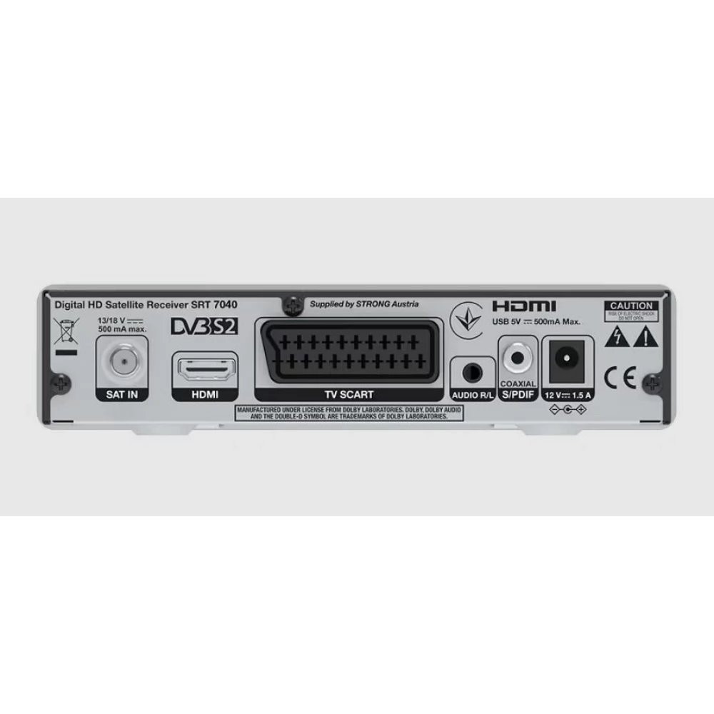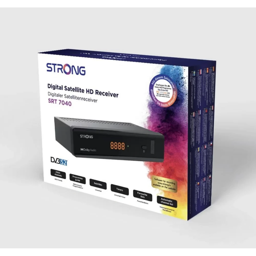 Uživajte u iskustvu gledanja televizije uz ovaj digitalni satelitski prijemnik visoke razlučivosti SRT7040. Jednostavna upotreba, izbornik jednostavan za korištenje i praktične funkcije čine prijemnik pouzdanim partnerom u kućnoj zabavi. Osim toga, prikladan je i za reproduciranje digitalne Free-To-Air televizije i radija putem satelita. Prijemnik se također boduje mnogim drugim korisnim funkcijama, poput brzog pretraživanja kanala, popisa favorita za individualni odabir TV i radijskih programa, rezervacije događaja izravno iz elektroničkog programskog vodiča (EPG), teleteksta i još mnogo toga, što je standardna oprema STRONG prijemnika.