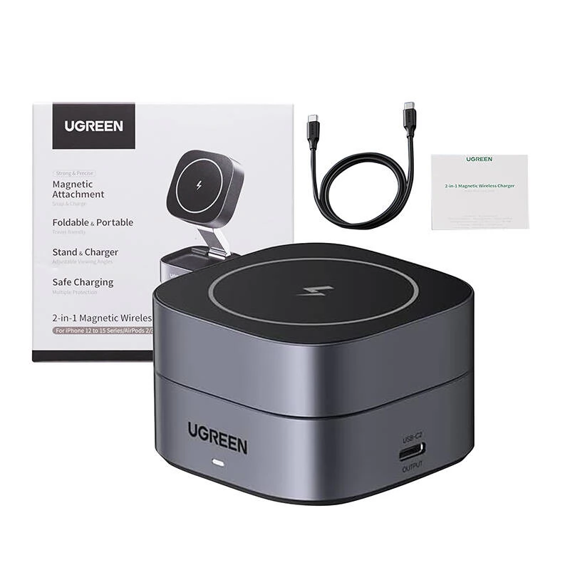 Ugreen W256 Qi 2-u-1 induktivni punjač je napredno rješenje za punjenje koje vam omogućuje istovremeno punjenje iPhonea i AirPoda, što ga čini praktičnim i štedi vrijeme. Sa svojim modernim dizajnom i mnogim funkcijama, može biti savršen dodatak svakom uredu, domu ili čak u pokretu. Napomena: USB-C punjač nije uključen.