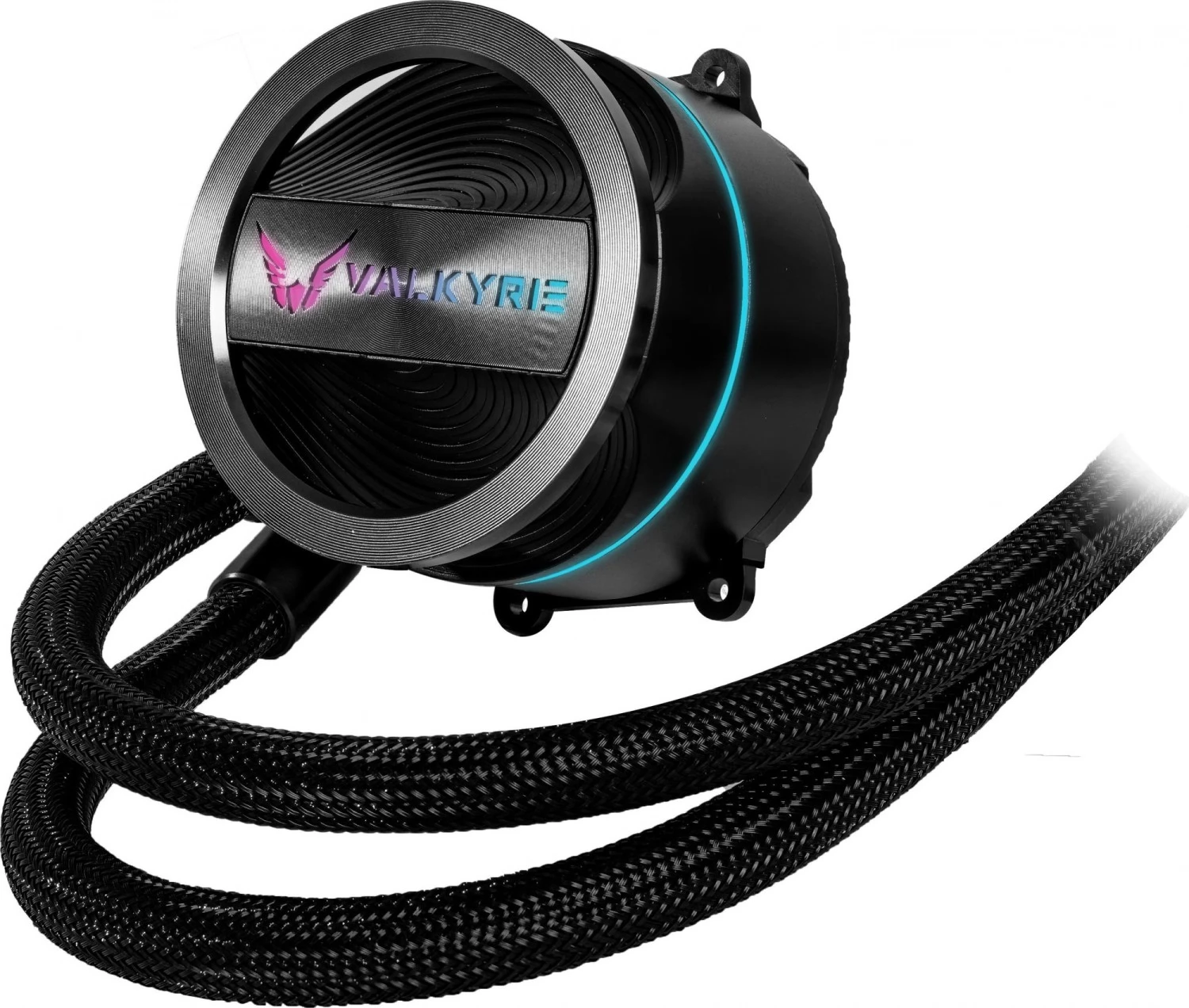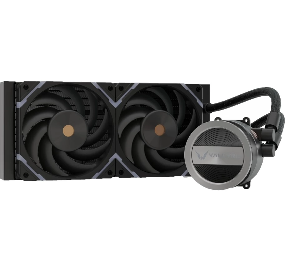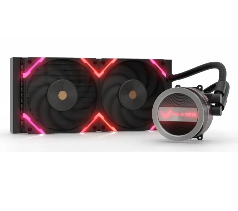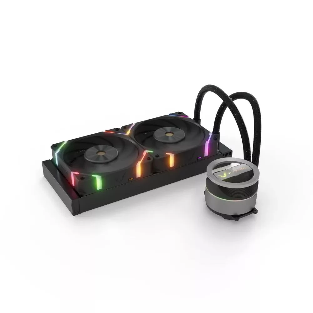 Kompaktno univerzalno vodeno hlađenje s 2 120 mm kontrolirana ARGB osvjetljenja (na uglovima okvira ventilatora) i PWM ventilatorom za kontrolu brzine, 240 mm radijator i također kontrolirano ARGB osvjetljenje (logo marke) CPU blok vodenog hlađenja, čiji se poklopac može okretati, prilagođene orijentaciji kućišta.