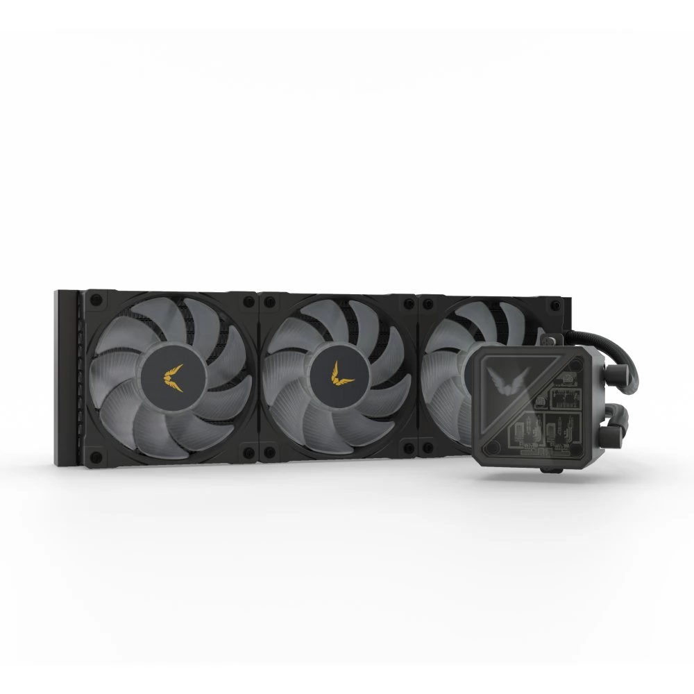 Kompaktno univerzalno vodeno hlađenje s 3 ventilatora od 120 mm s upravljivim ARGB osvjetljenjem i PWM kontrolom brzine, radijatorom od 360 mm i mehanički dizajniranim CPU blokom za vodeno hlađenje koji također ima upravljivo ARGB osvjetljenje. Poklopac pumpe može se okretati za 90 stupnjeva, prilagođavajući se orijentaciji kuće.