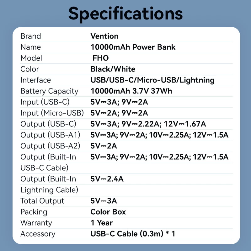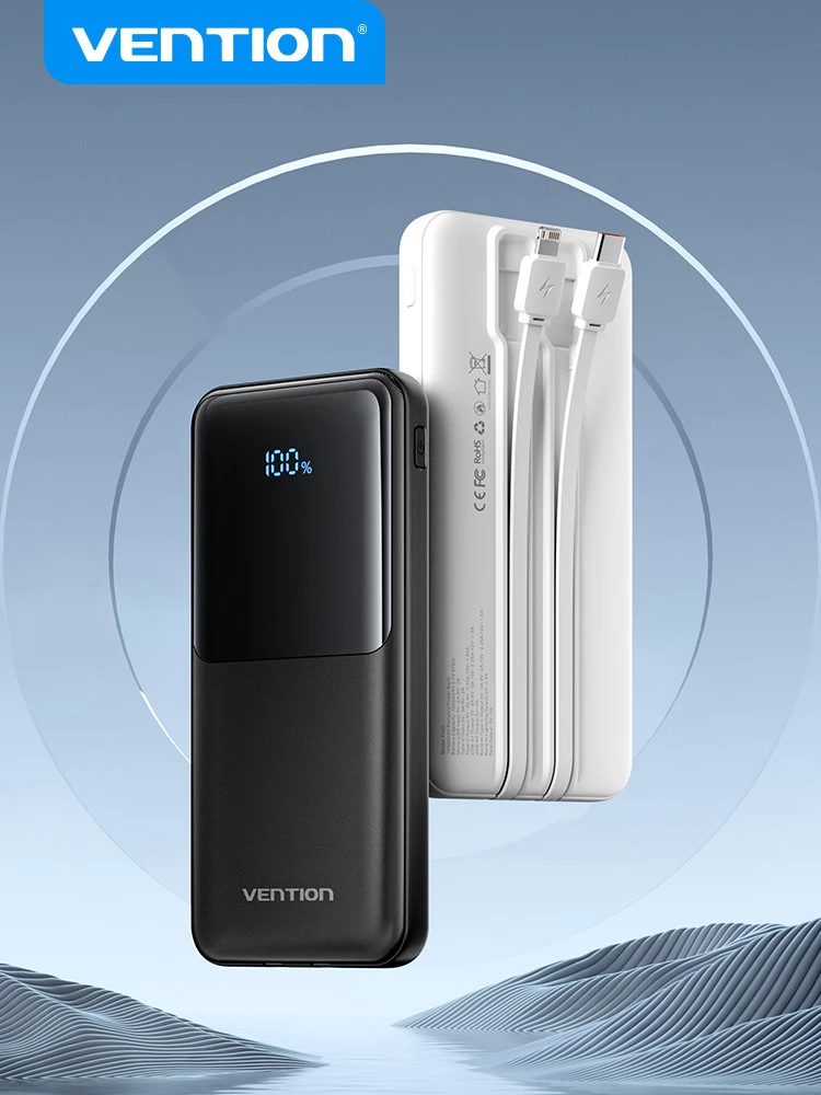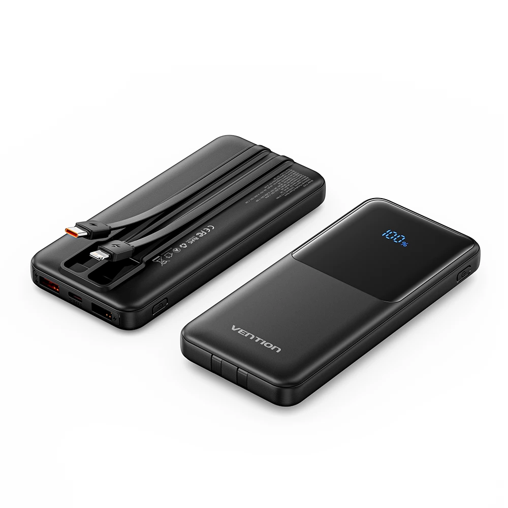 Ako trebate puniti svoj uređaj dok ste u pokretu, Vention power bank je savršen izbor. Zahvaljujući velikom kapacitetu od 10.000 mAh, daje dovoljno energije za mobitele i tablete. Prednost Vention 10000mAh Power Bank s integriranim USB-C i Lightning kabelima 22,5W power bank je što ima 5 izlaza, uključujući dva integrirana kabela (USB-C i Lightning). Možete puniti sve svoje uređaje bez traženja kabela.