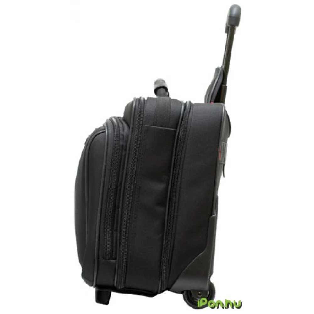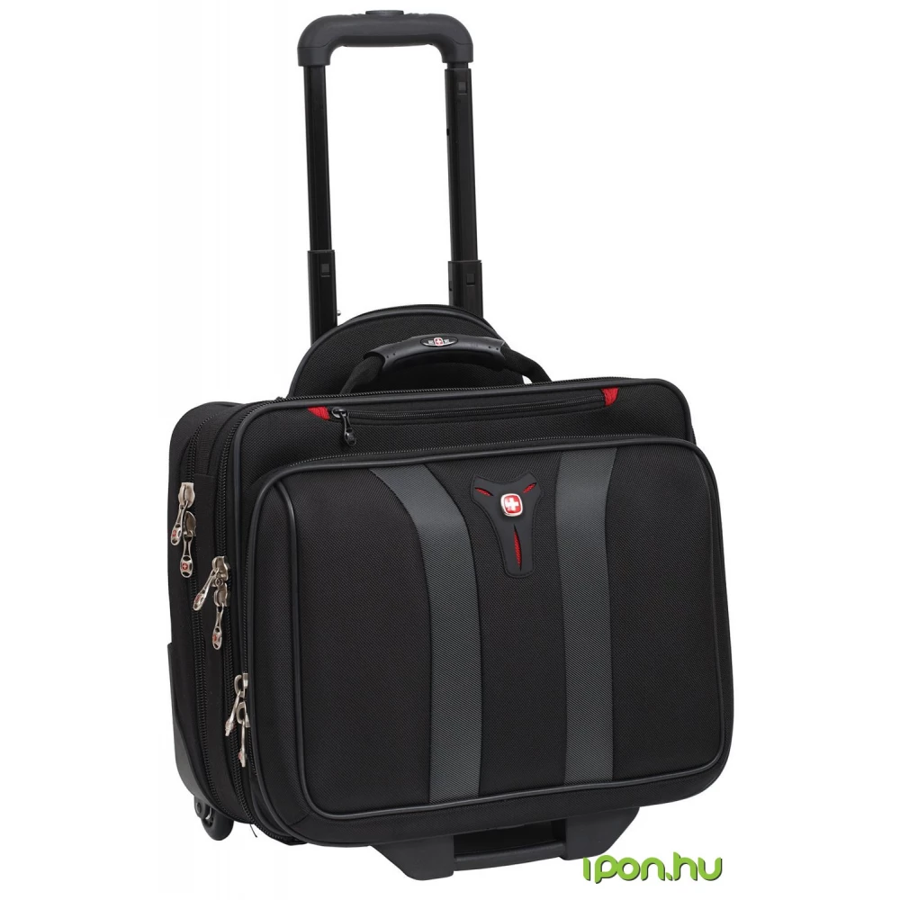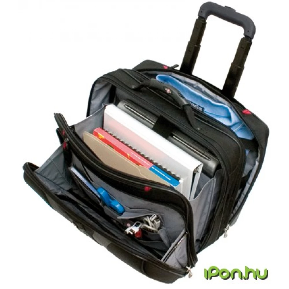 Wenger putna torba na kotrljanje s držačem za laptop. S udobnom gornjom ručkom. S dva tiha kotačića, ručkom za povlačenje s gumbom. S manjim prednjim džepom s patentnim zatvaračem za brzi pristup. Jedan prednji pretinac s patentnim zatvaračem s otvorenim džepovima, držačem za olovke, držačem za telefon. S pretincem na patentni zatvarač za odjeću i ostale dodatke. Odvojeni podstavljeni pretinac za prijenosno računalo s patentnim zatvaračem za 17" prijenosna računala. Osim prijenosnog računala, tu je i prostor za dokumente, pribor i druge dodatke.